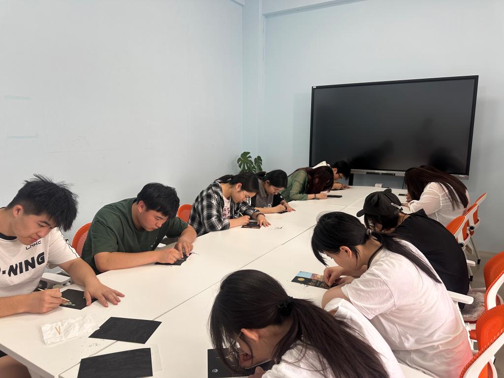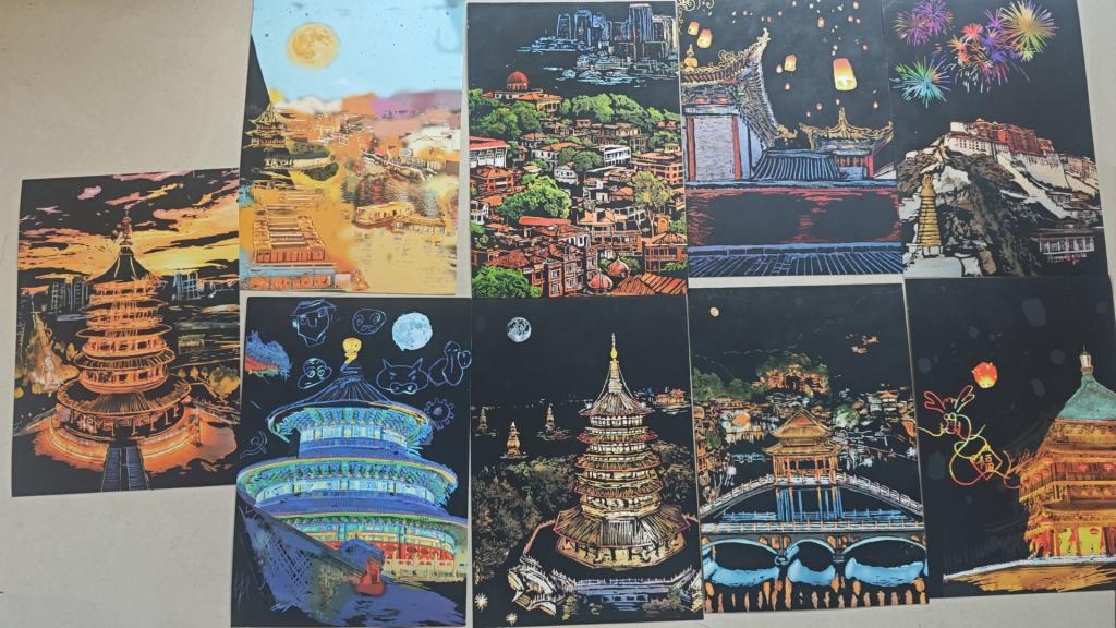 在创作中,同学们发挥创意,有的以校园生活为蓝本,展现青春活力;有的聚焦城市经典著名景点展开创意,在创作里沉浸式感受不同城市风景的魅力,也释放了日常学习压力,抒发对美好心理状态的向往。让同学们感受到了刮画魅力与创作者的心理表达,营造了关注心理健康、积极创作交流的氛围。