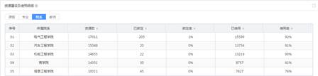 资源数最高的教学单位为17011个,平均资源数为7647个;使用率最高为96%,平均使用率为78%。