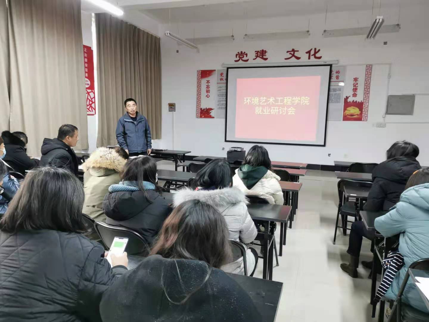 12月14日,环境艺术工程公司在明爱楼一楼公司党建活动室召开就业研讨会,公司党总支书王永主持会议,环艺公司教职工30余人参加会议。