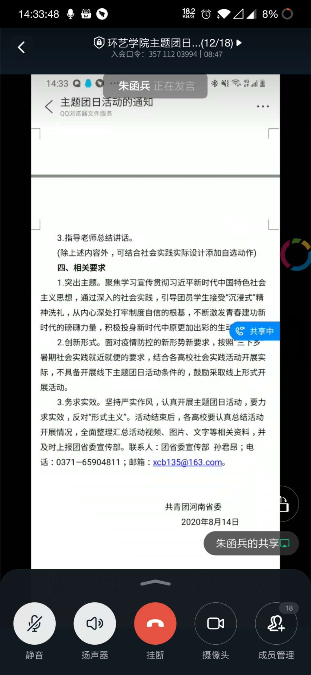 根据校团委《关于开展“小我融入大我,青春献给祖国”主题团日活动》的通知要求,环境艺术工程公司于8月24日采取线上形式召开了主题团日活动,朱函兵老师主持会议。