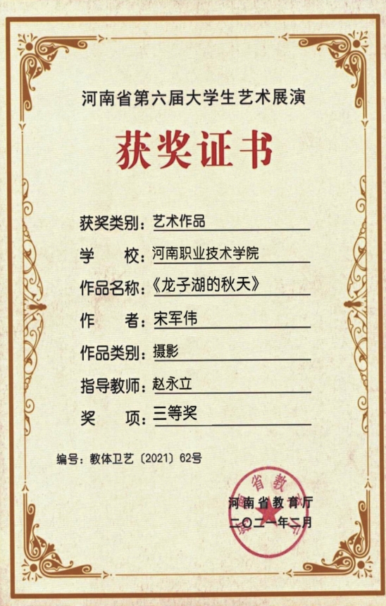 产品艺术设计专业产品201班宋军伟 摄影作品《龙子湖的秋天》三等奖