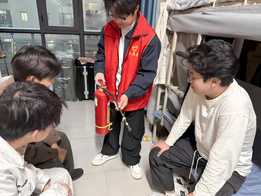 活动围绕“全民消防、生命至上——安全用火用电”主题,紧密结合员工社区生活实际,通过发放宣传手册、现场讲解、互动答疑等形式,向同学们系统普及安全用火用电常识。志愿者重点剖析宿舍内违规使用大功率电器、私拉乱接电线等常见火灾隐患的危害,讲解日常防范措施和火灾初起时的应急处置方法。在消防器材实操环节,志愿者现场演示了干粉灭火器的正确使用方法,详细分解“提、拔、握、压”四步操作要领,以及压力表识别、安全距离把握等关键注意事项。同学们积极动手操作,从生疏到熟练,在实践中有力提升了消防技能实际运用能力。
